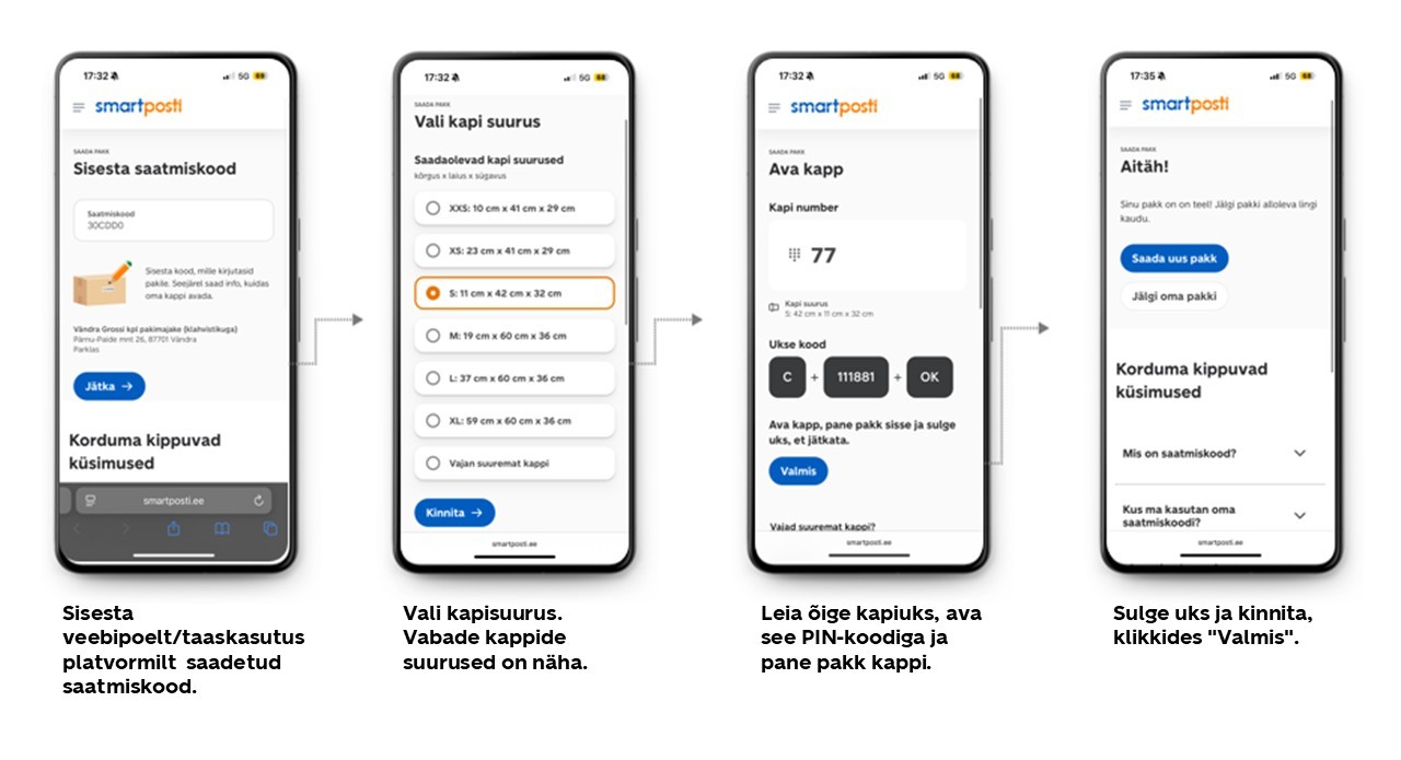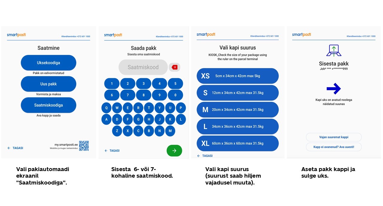 Vali ekraanil "Saada pakk" ning seejärel vali „Saatmine saatmiskoodiga“. Sisesta saatmiskood, vali kapi suurus, aseta pakk kappi ja sulge uks korralikult. Kui kapi suurus ei sobi, saad seda muuta vajutades ekraanil "Vajan suuremat kappi".