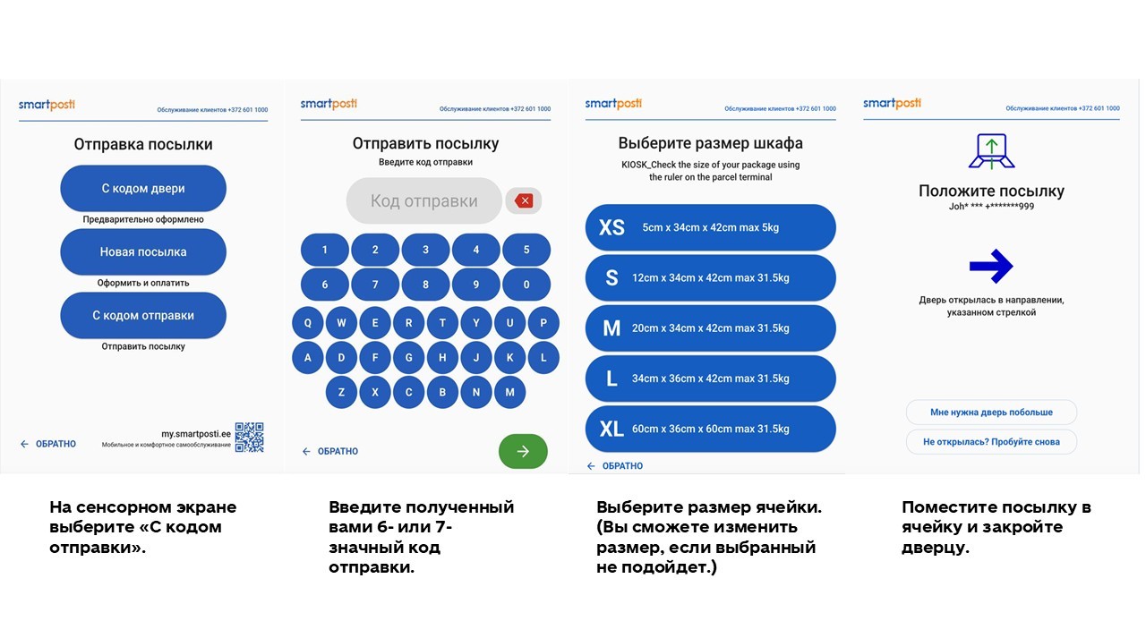 Выберите на экране „Saatmiskoodiga“/ «С кодом отправки». Введите код отправки, выберите размер ячейки, поместите посылку в ячейку и как следует закройте дверь. Если размер ячейки не подходит, его можно изменить.