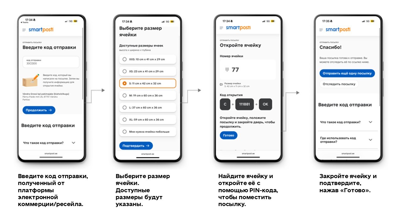 Найдите верную дверь ячейки, откройте ее с помощью кода на экране (PIN-код) и поместите посылку в ячейку. Если посылка не помещается в выбранную ячейку, можно изменить ее размер. Закройте дверь и нажмите на экране телефона „valmis”/«готово».